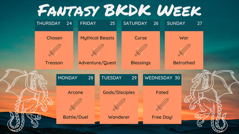 All forms of content are allowed (art / writing / etc.) and please tag us with #fantasybkdkweek so we can see and retweet it! We also have a collection on AO3 here.